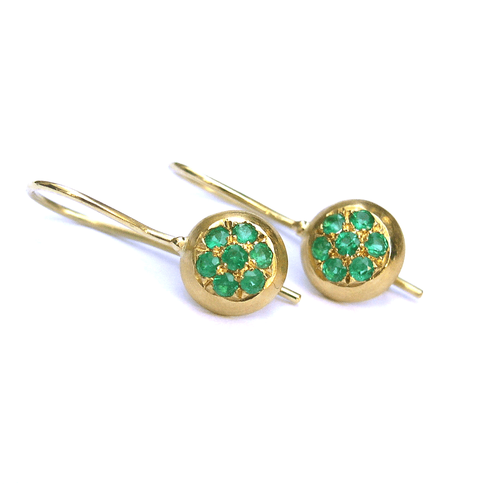 For emerald lovers, here are 18K gold earrings set with pavé for an exotic look that captivates attention with its beauty. A hanging dome on a chain features a central emerald, surrounded by six additional emeralds.